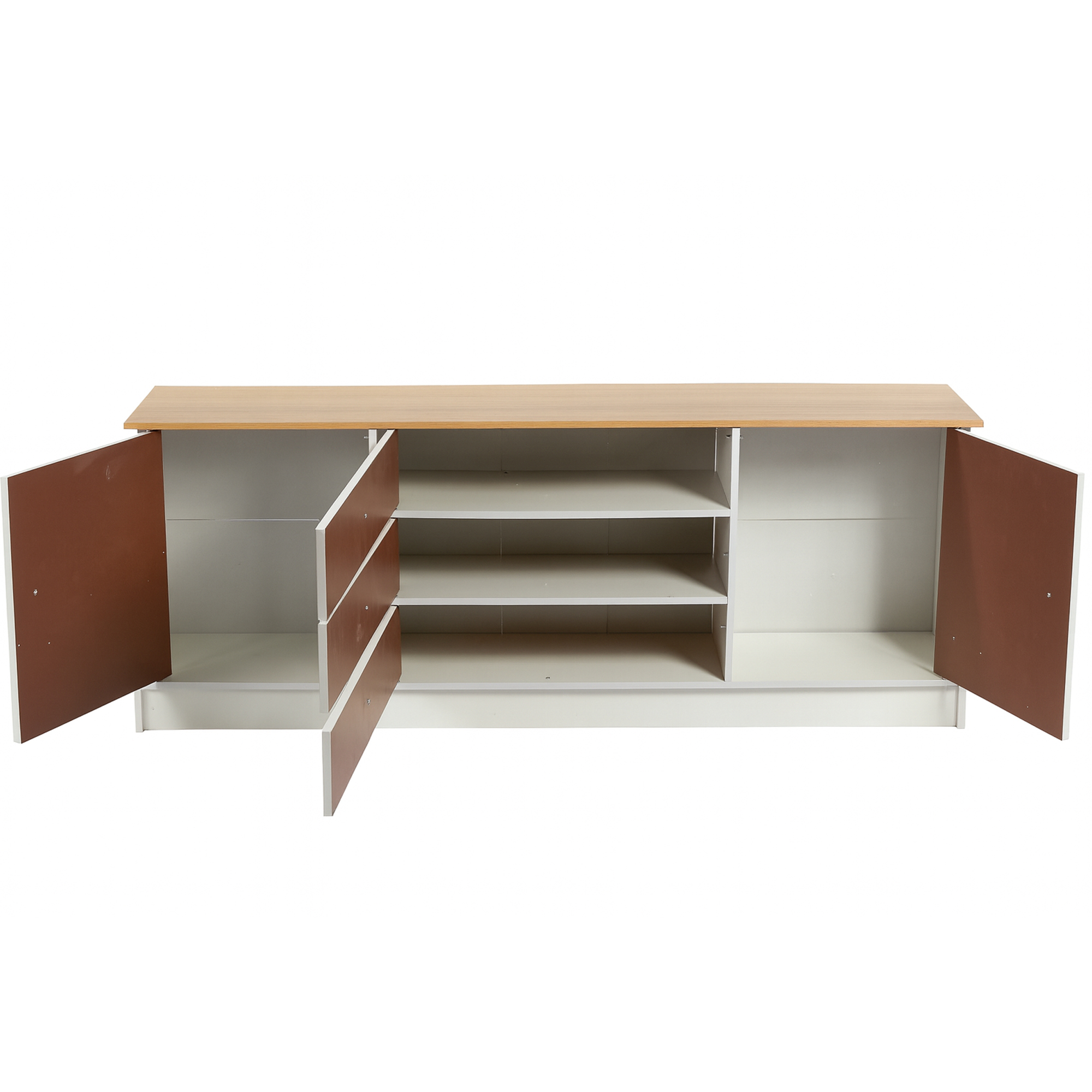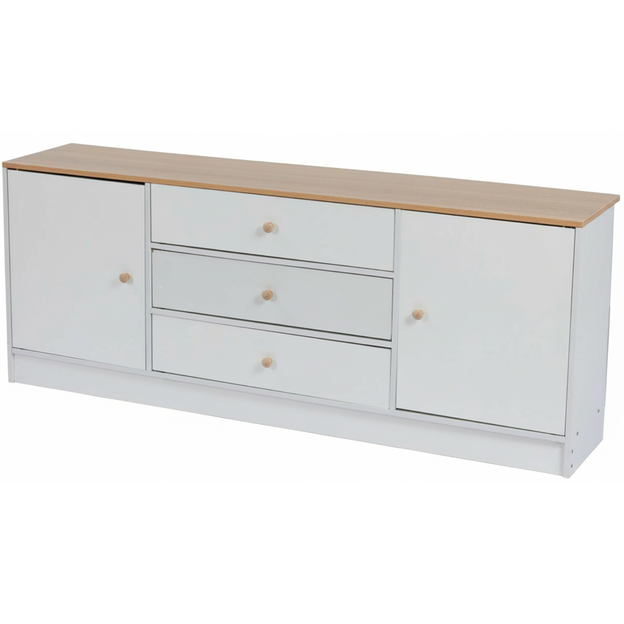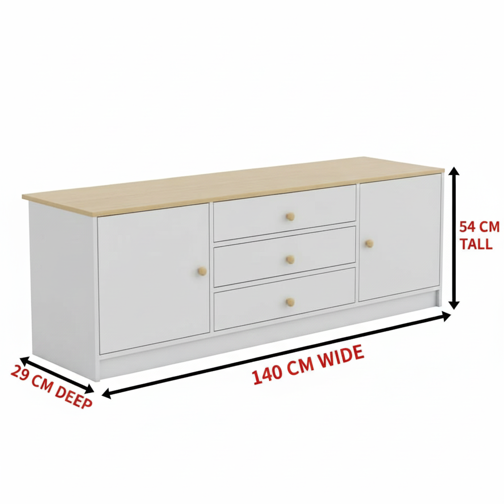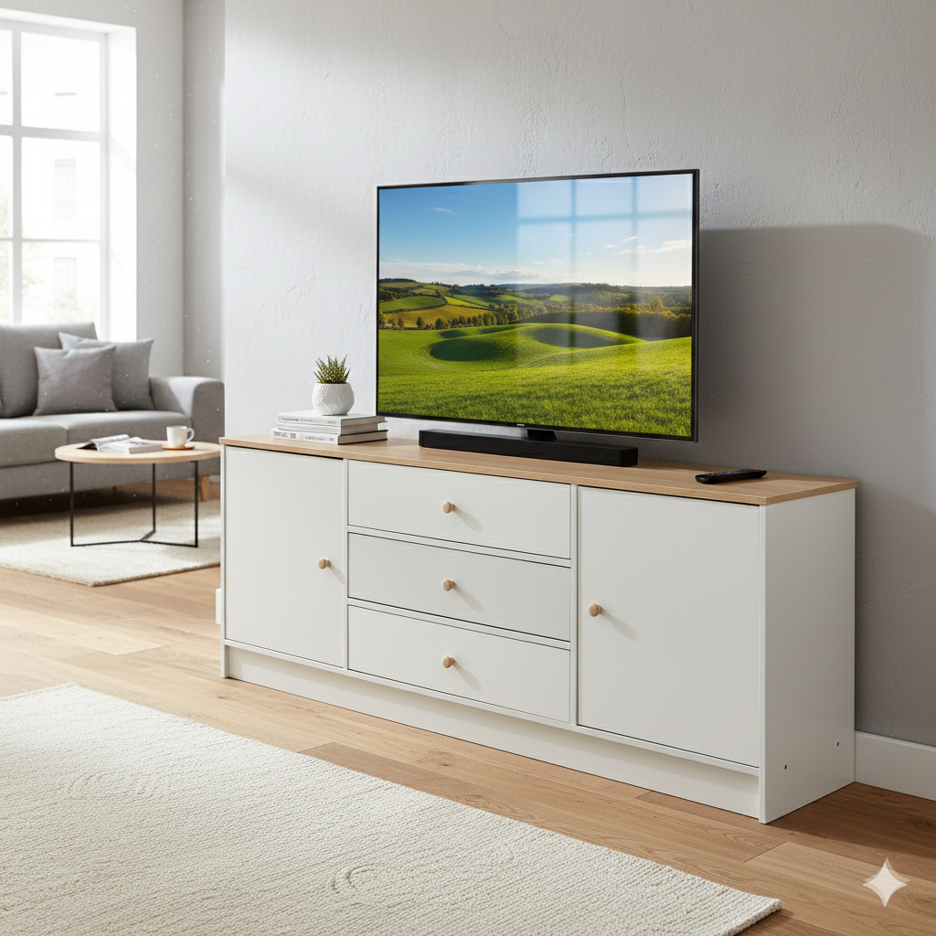 A clean, minimalist white TV stand designed for modern homes and condos. Features a wide tabletop for TVs, 3 smooth-glide drawers, and 2 closed storage cabinets to hide clutter and keep your space organized.